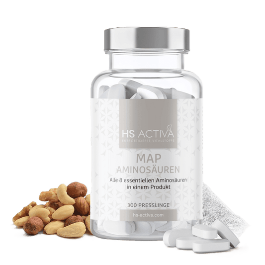 • Product shot of HS Activa MAP Aminosäuren bottle showing white pills cashews hazelnuts and walnuts against a white background