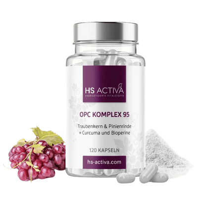 Das OPC von HS Activa liegt in Form von hochwertigem Traubenkernextrakt und Pinienrindenmark (Extrakt 95%) vor. Außerdem haben wir unserem Produkt Curcuma und Bioperine beigemischt. Diese beiden Stoffe haben zusätzliche antioxidative, entzündungshemmende und entgiftende Eigenschaften, welche die Wirkung des Produkts noch weiter erhöhen.