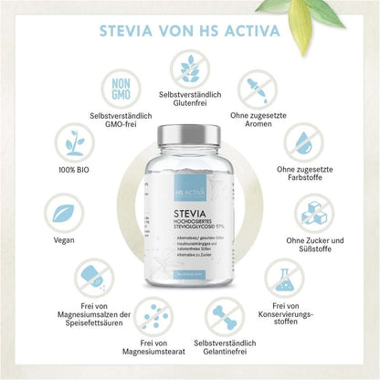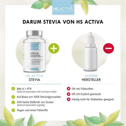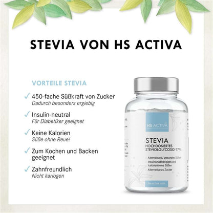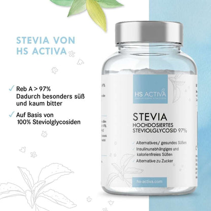 Stevia von HS Activa basiert auf 100% Steviolglycosiden, dem Süßstoff der Stevia-Pflanze, welcher vom Menschen aber nicht verdaut wird.